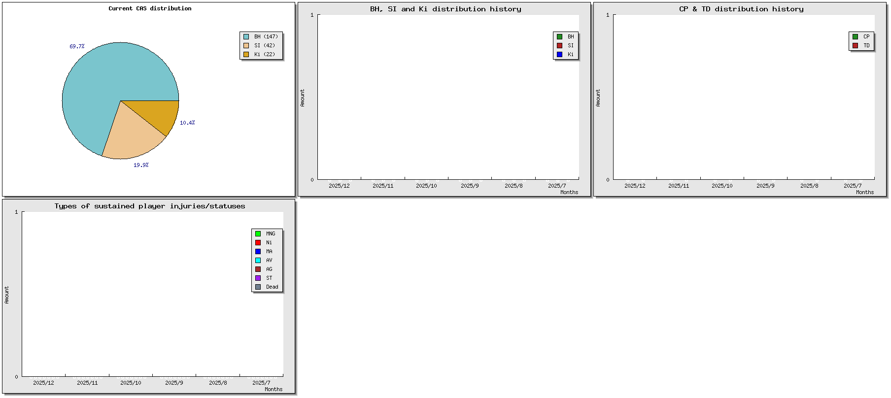 | # | Nome | Razza | Valore | W | D | L | GP | WIN% | SW | SD | SL | GF | GA | Td | Cp | Int | Cas | BH | Si | Ki | tcasf | tcasa | tcdiff | SMP | WT | ELO |