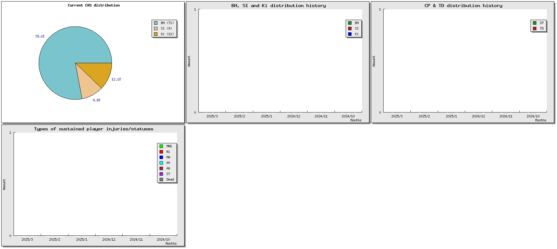 | # | Nome | Razza | Valore | W | D | L | GP | WIN% | SW | SD | SL | GF | GA | Td | Cp | Int | Cas | BH | Si | Ki | tcasf | tcasa | tcdiff | SMP | WT | ELO |